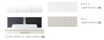 壁やカウンターと組み合わせて楽しめるカラーを豊富にご用意。目地のないモザイクタイル調や鋼板製など、お手入れがラクな品揃えです。