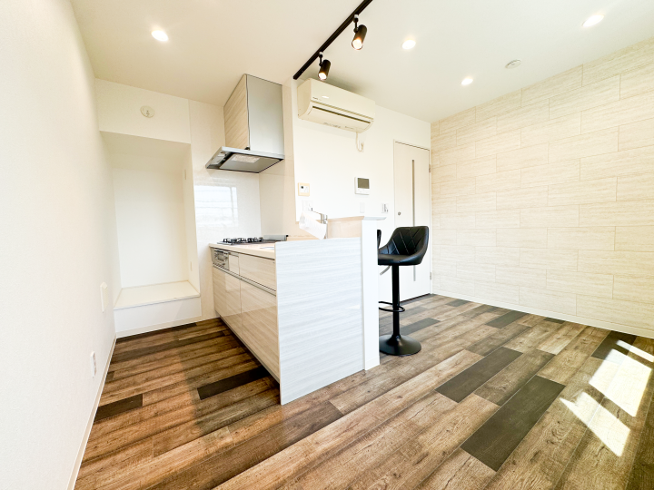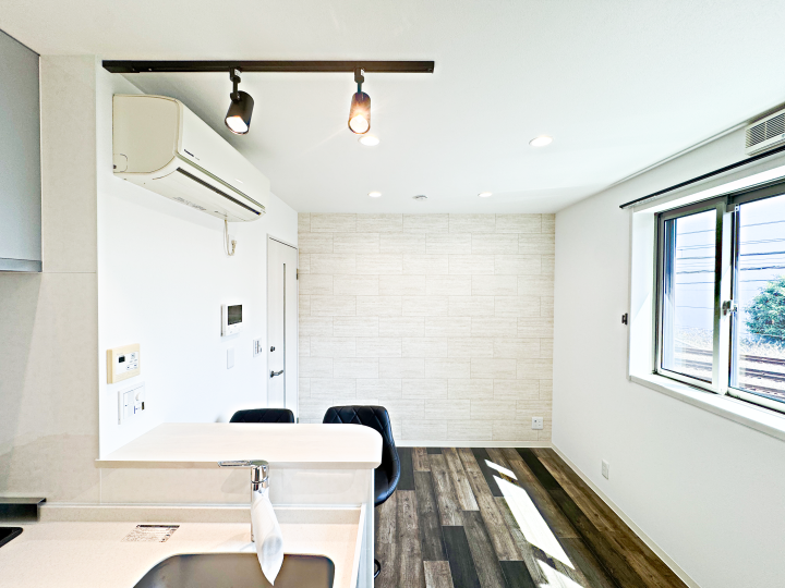 ダウンライトで均一に明るさを確保しつつ黒のライティングレール照明を組み合わせることで、キッチンやカウンターを機能的かつスタイリッシュに演出。シンプルながら居心地のよい、洗練された空間に変身しました。
