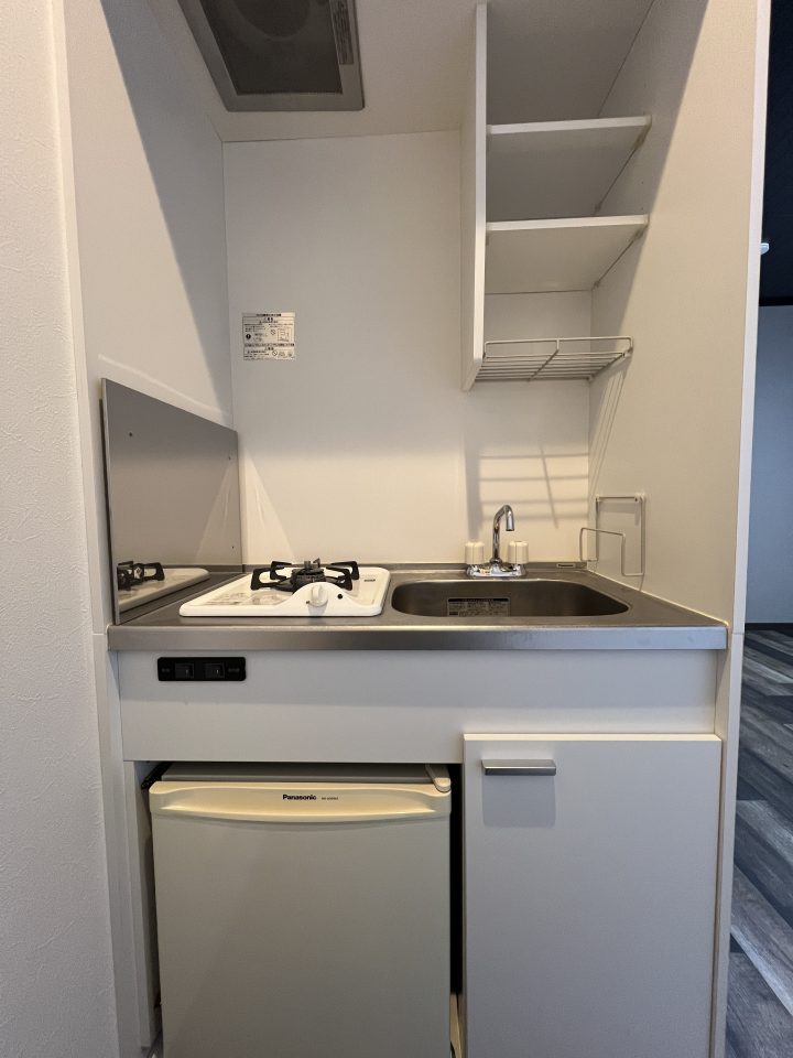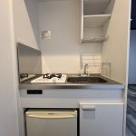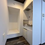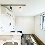 白を基調としたシンプルで明るいキッチン。コンパクトながら機能的で、アクセントのライティングレールが空間を引き締めています。全体に開放感のある、心地よい印象になりました。