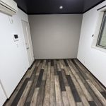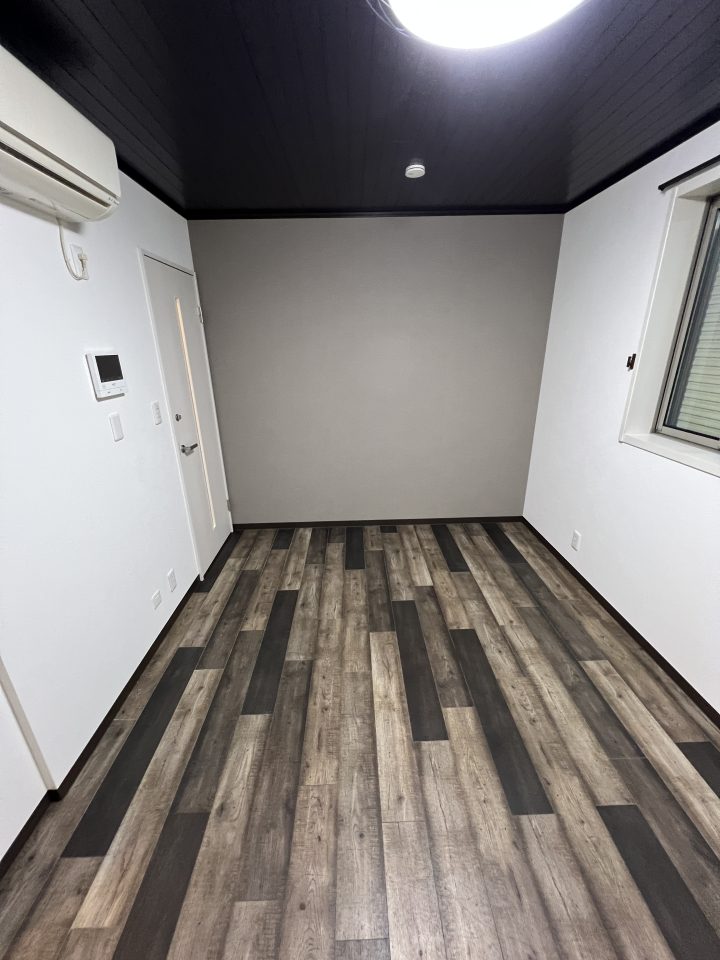 天井にベニア板を張って白いクロスに仕上げたことで、部屋全体が明るい印象に。また、壁の奥にはアクセントクロス: サンゲツFE76618を採用することで、空間に奥行きとデザイン性をプラス。
