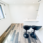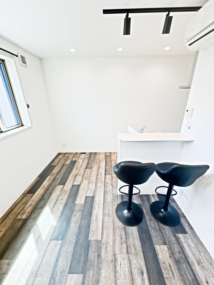 明るいカウンターに引き締め効果のある黒いチェアが加わり、空間全体がスタイリッシュにまとまりました。