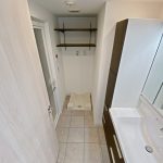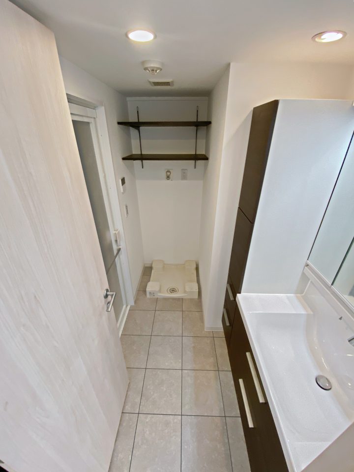 洗濯機上に収納を新設しました。収納する物の高さに合わせて棚の位置を変更できる稼働棚のタイプです。洗面台と木目柄の色味を合わせて統一感をだしました。