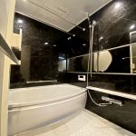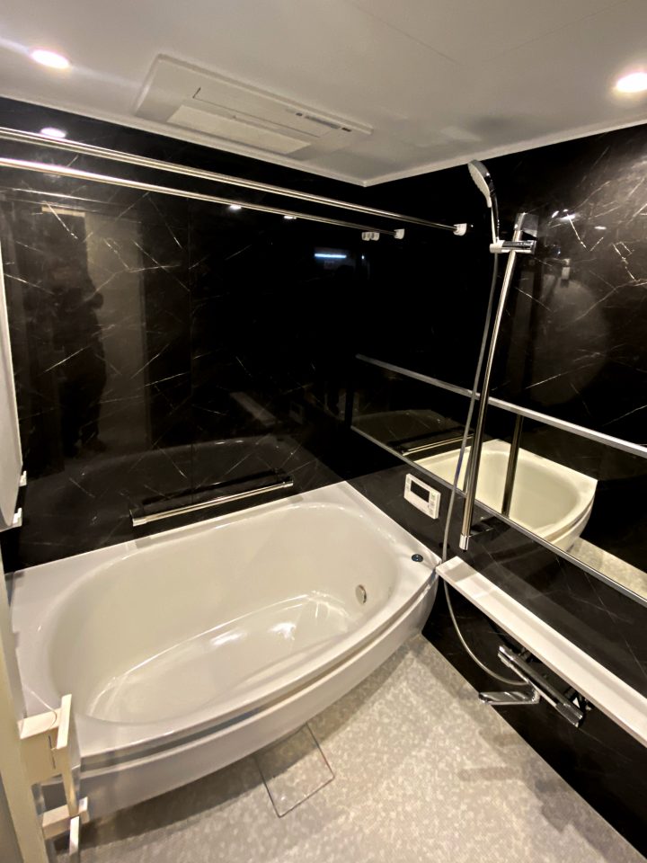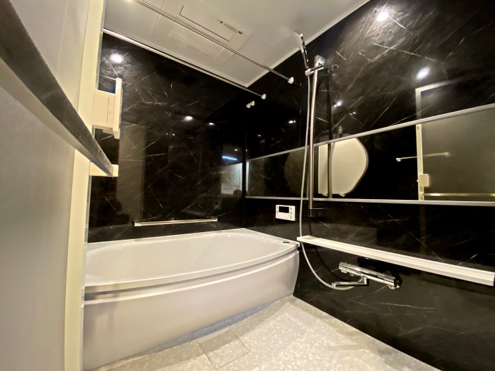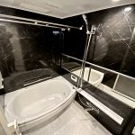 TOTO リモデルバスルームWYシリーズ Tタイプ。 アクセントパネルは大胆な流れ模様が高級感漂う大理石調柄のマルキーナグレーです。