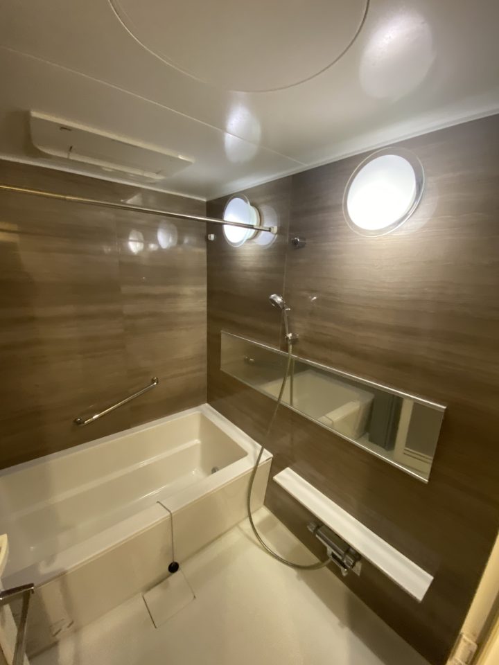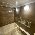 以前の浴室のアクセントパネルは木目柄で浴槽シはンプルなつくりでした。