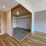 畳はigusamono 縁あり カラー畳 銀鼠を採用しました。こちらの畳は人工樹脂でできておりカビや汚れなど天然のものよりもお手入れしやすいです。