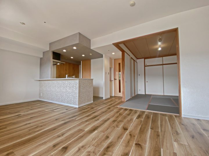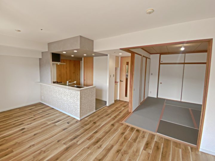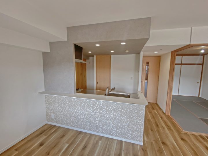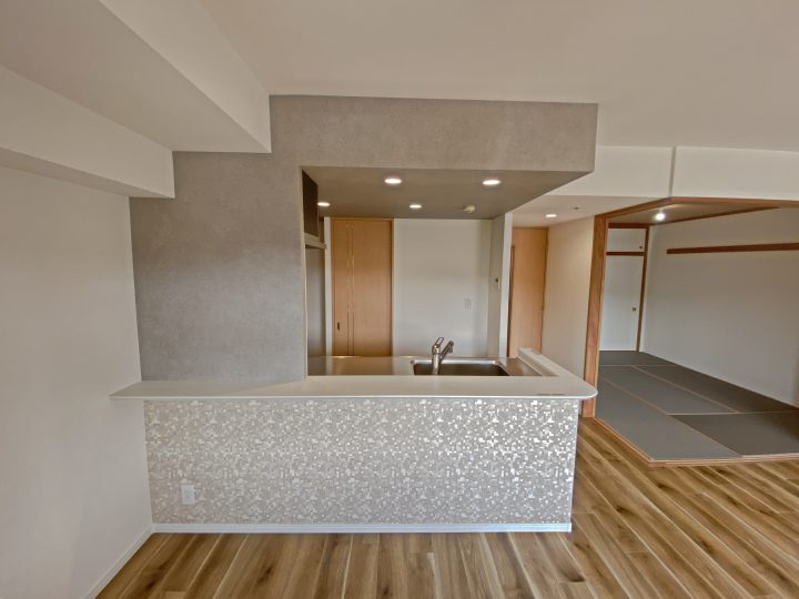 開放的で様々なクロスが織りなすお洒落なキッチンが完成しました♪洋風にもなじむ落ち着いたカラーの畳とキッチン部分のクロスが調和したナチュラルモダンなLDKに。
