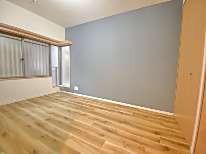 アクセントクロスには石目調の落ち着いたネイビーカラーのLB-9576を施しました。アクセントクロスとして使いやすくあらゆるテイストにオススメです。床材とも良くマッチしており北欧風の印象になりました。