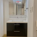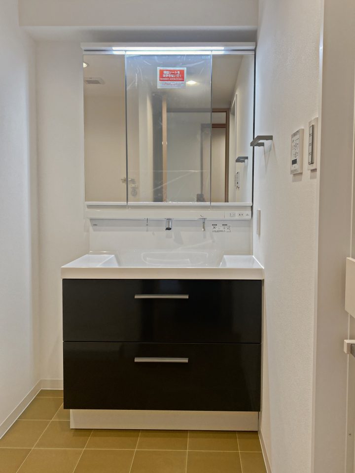 LIXIL EV W=900 。シックで大人な印象のディープグレーの扉カラーをチョイスしました。EVはキレイアップ水栓のおかげでお手入れ楽々♪水回りは汚れがたまりやすいので綺麗を保ちやすいのはとても魅力的ですね。