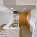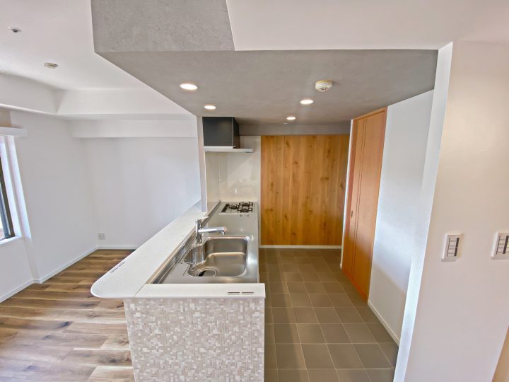 キッチンの天井部分には石目調のニュアンスのあるグレーのクロスを施しました。カウンターの腰壁部分に使用したのはサンゲツRE-55665。パールの光沢やタイル面の素材感が高級感を演出するモザイクタイル柄です。