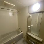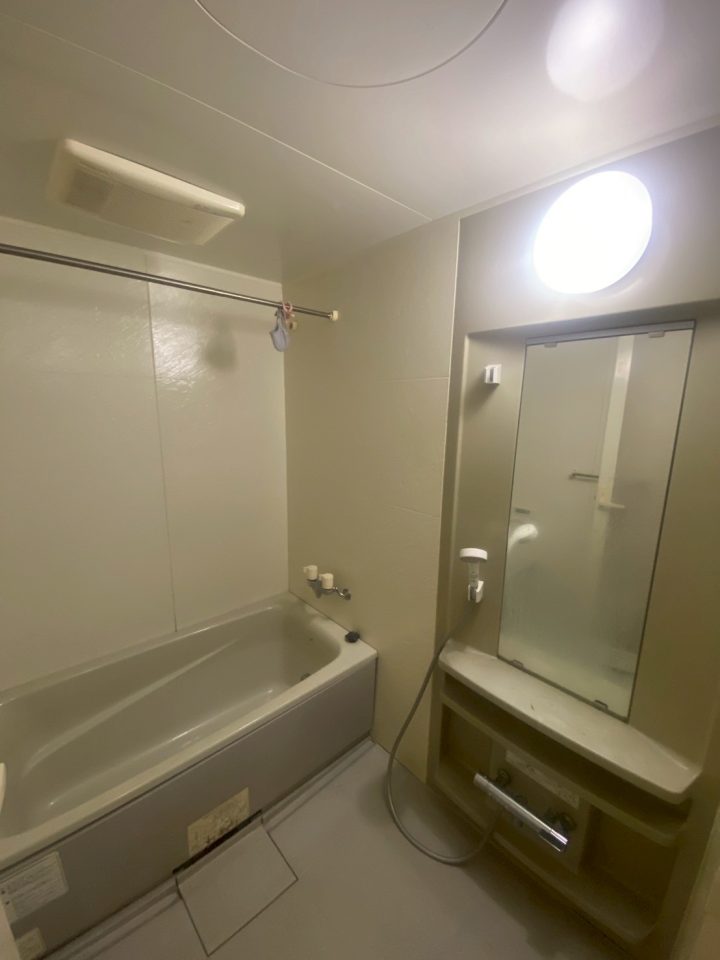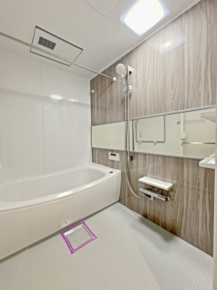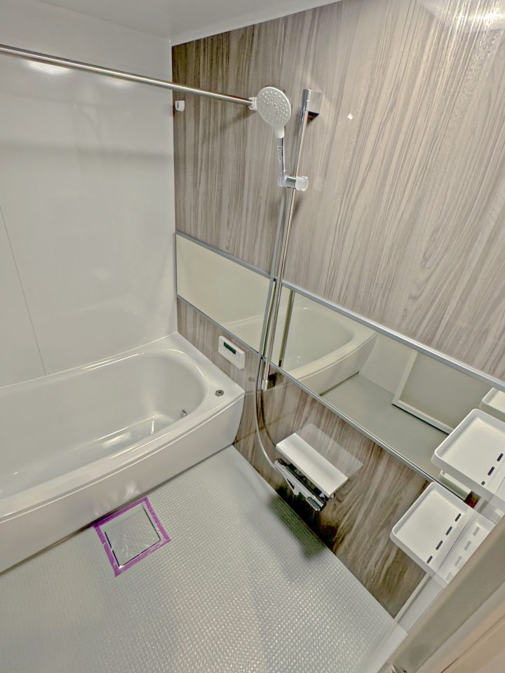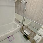 お掃除ラクラクワイドミラーを取付け空間に奥行きがでました。水栓カウンターはシンプルなタイプを採用しお手入れもしやすくなりましたね!シャワーバーもお好みの高さに調整可能です。