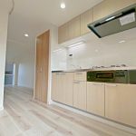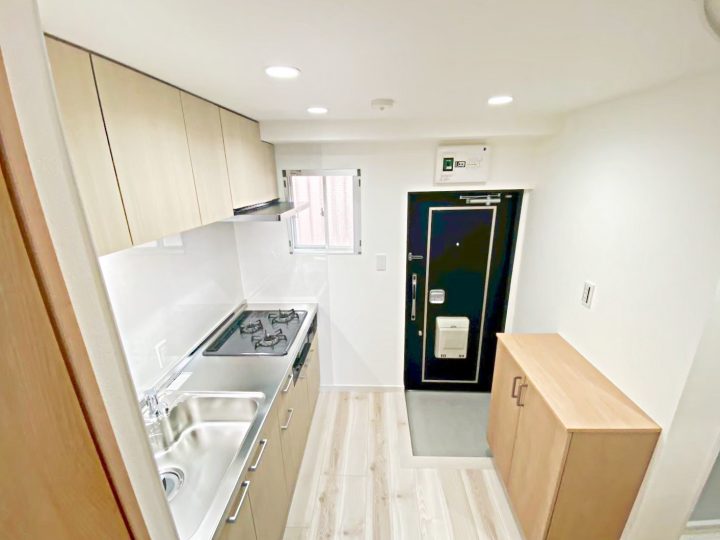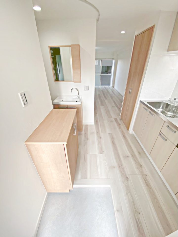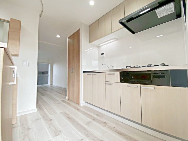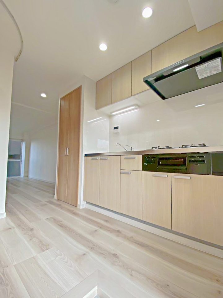 玄関を入ると明るいカラーの木目柄のキッチンがお出迎えしてくれます♪