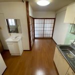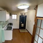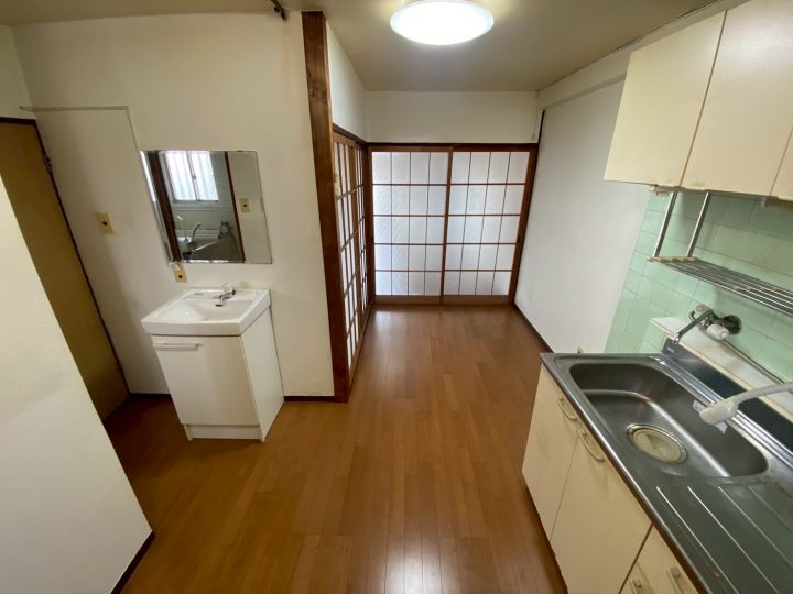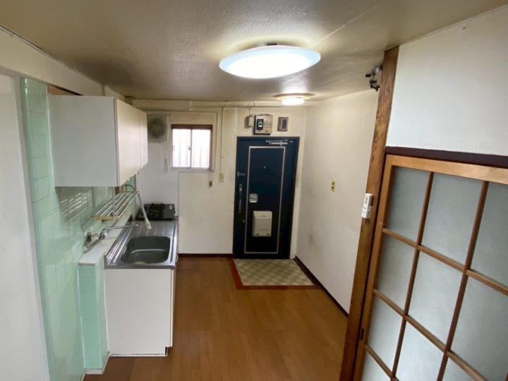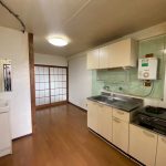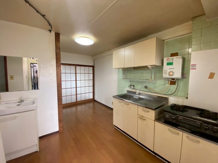 以前のキッチンスペースです。ガスコンロはテーブル型で給湯器もキッチンにあることで古めかしい印象でした。