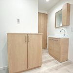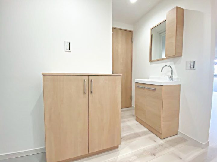 建具・洗面台・下足入れともに同じメーカーにすることで扉カラーを統一することができました。ナチュラルなカラーに癒されます。