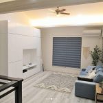 リビングのインテリアはブルーデニムのソファが主役のリラックス空間。カーテンは立川ブラインドのロールスクリーン/デュオレのシエンテ