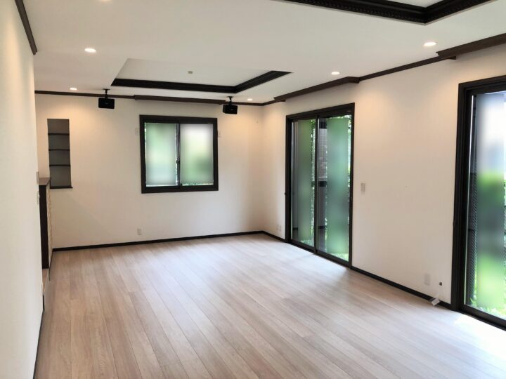 織りあげ天井のモールディングや巾木・窓枠はダークカラーのため、引き締まった印象に。
