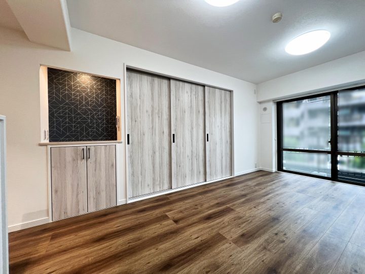 築37年のマンションリノベーションを行いました。以前LDの横にあった洋室は和室へ変更。キッチンは移設して対面キッチンに変更しました。ヴィンテージ風の色味のフローリングに木目柄のアクセントクロスを合わせたことで、瑞々しいグリーンが映えそうな居心地の良いナチュラルビンテージテイストの空間に生まれ変わりました。