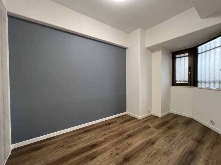 腰壁の上の部分をふかし、平面に。ネイビーのアクセントクロスをあしらい落ち着きのある空間を演出します。