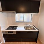 コンロはビルトイン仕様になったのでお掃除が楽になりました。カウンターは人口大理石。またスライド収納は物の出し入れがしやすいです。
