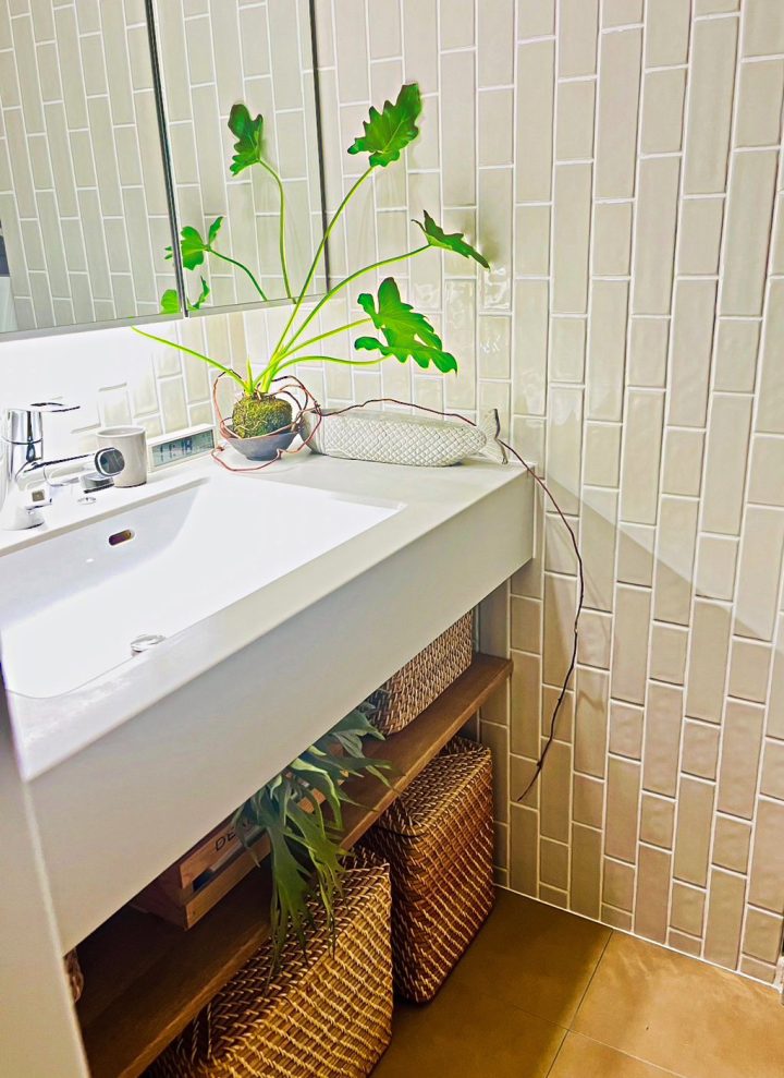 タイルには名古屋モザイクのマルアークRF−41を使用。ソフトなカラーと釉薬のむら感がナチュラルなインテリアによく馴染むタイルです。ラタンとグリーンの雑貨がとてもマッチしていますね。