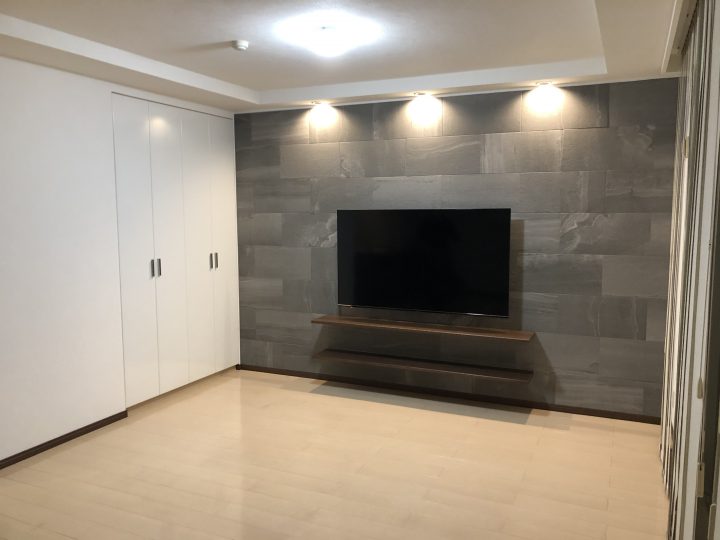 テレビは壁掛けが出来るよう、壁の下地を補強。テレビの下にはPanasonic/インテリアカウンター ウォールナット柄を設えました。配線も見えない為、すっきりとした見た目になります。
