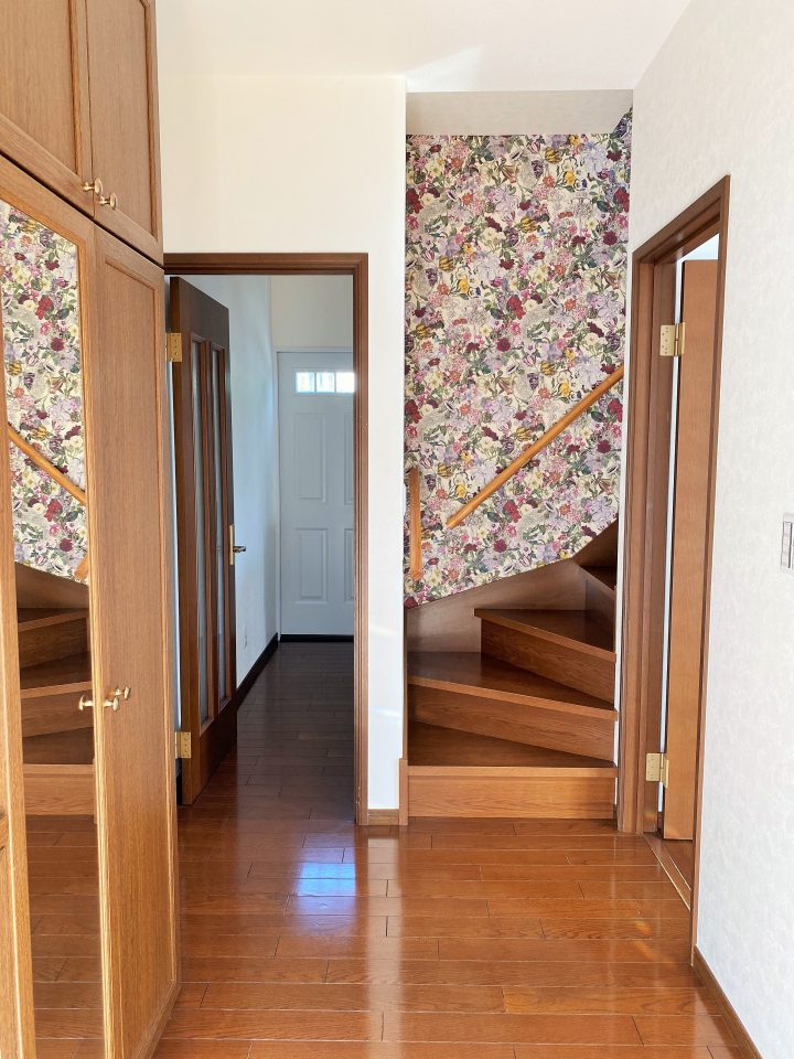 玄関ホールから見える花柄のクロスは、ミディアム系の既存床にもぴったり。