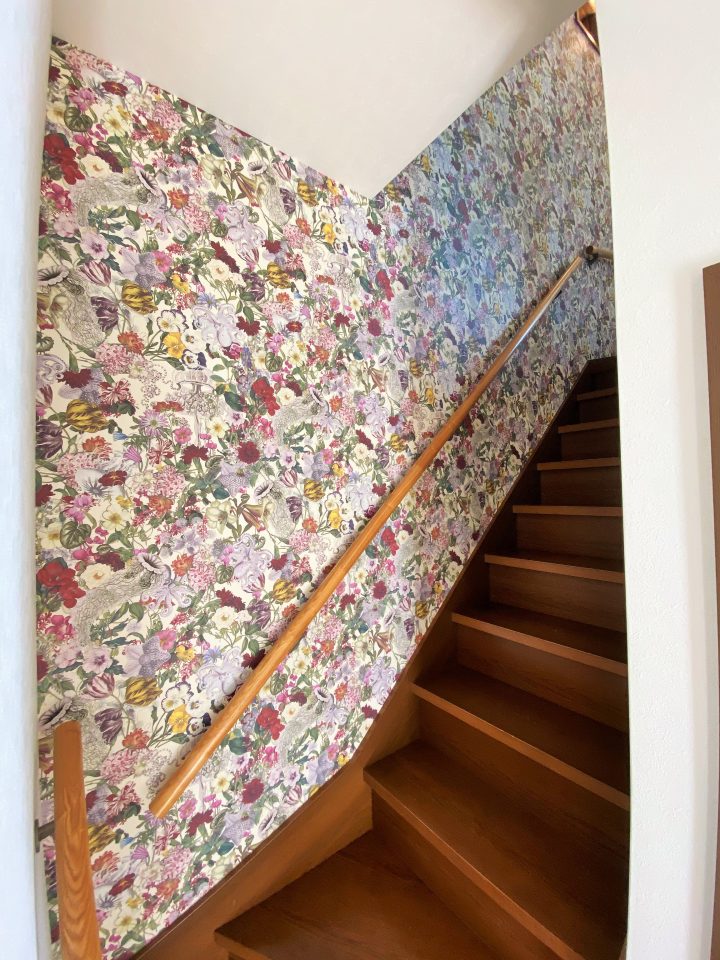 1階へ降りる階段の壁一面はエレガントで鮮やかな花柄クロスを配しました。上品な雰囲気と色合いが、ネイビーの洗面スペースともマッチします。アクセントクロス:RE-51410 -
