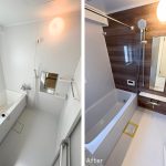 木目柄の鏡面パネルで高級感のある浴室に大変身。TOTO/マンションリモデルバスルーム color:ノルディ―グレーウッド 1216サイズ